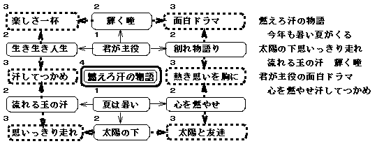 1と関係ある言葉を3つずつ考えます。 1に対して、それぞれ左右と上か下に並べます。 |